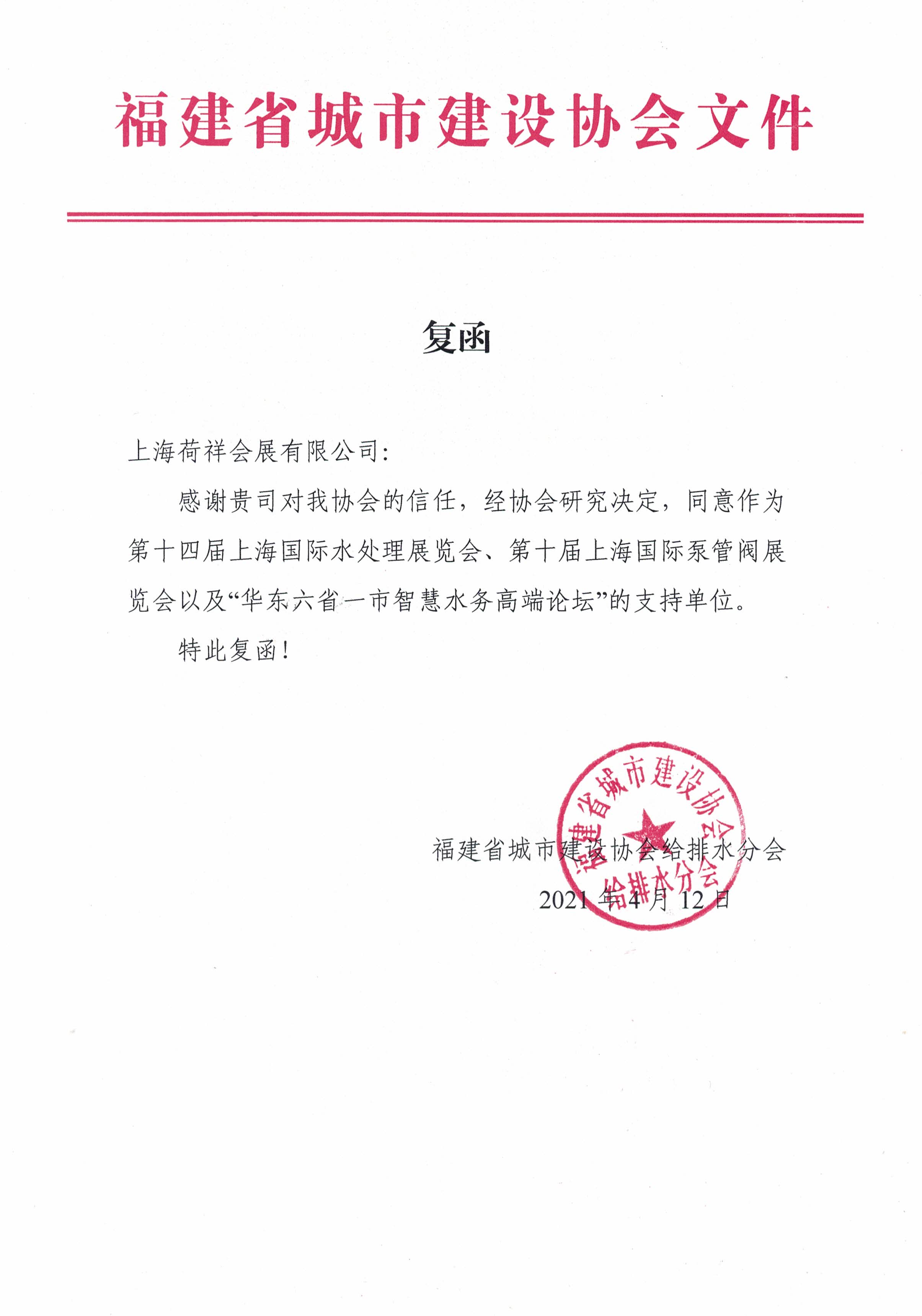 为帮助福建省水务企业进一步开拓市场,促进国内外企业之间的经贸合作与技术交流,福建省城市建设协会给排水分会决定将全力支持 2021 年 6 月 2 日在上海国家会展中心(虹桥)举办的2021华东六省一市智慧水务高端论坛,与主办方上海佰富彩主页会展有限公司携手为城镇水务行业搭建一个国际性商贸交流平台,助力企业更好的抓住行业机遇,积极促进我国城镇水务行业在"十四五"期间获得快速发展。