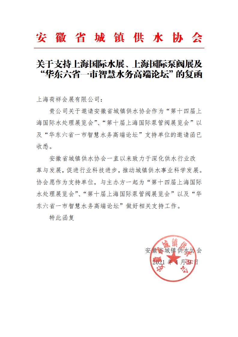 为帮助安徽省水务企业进一步开拓市场,促进国内外企业之间的经贸合作与技术交流,安徽省城镇供水协会决定将全力支持 2021 年 6 月 2 日在上海国家会展中心(虹桥)举办的2021华东六省一市智慧水务高端论坛,与主办方上海佰富彩主页会展有限公司携手为城镇水务行业搭建一个国际性商贸交流平台,助力企业更好的抓住行业机遇,积极促进我国城镇水务行业在"十四五"期间获得快速发展。